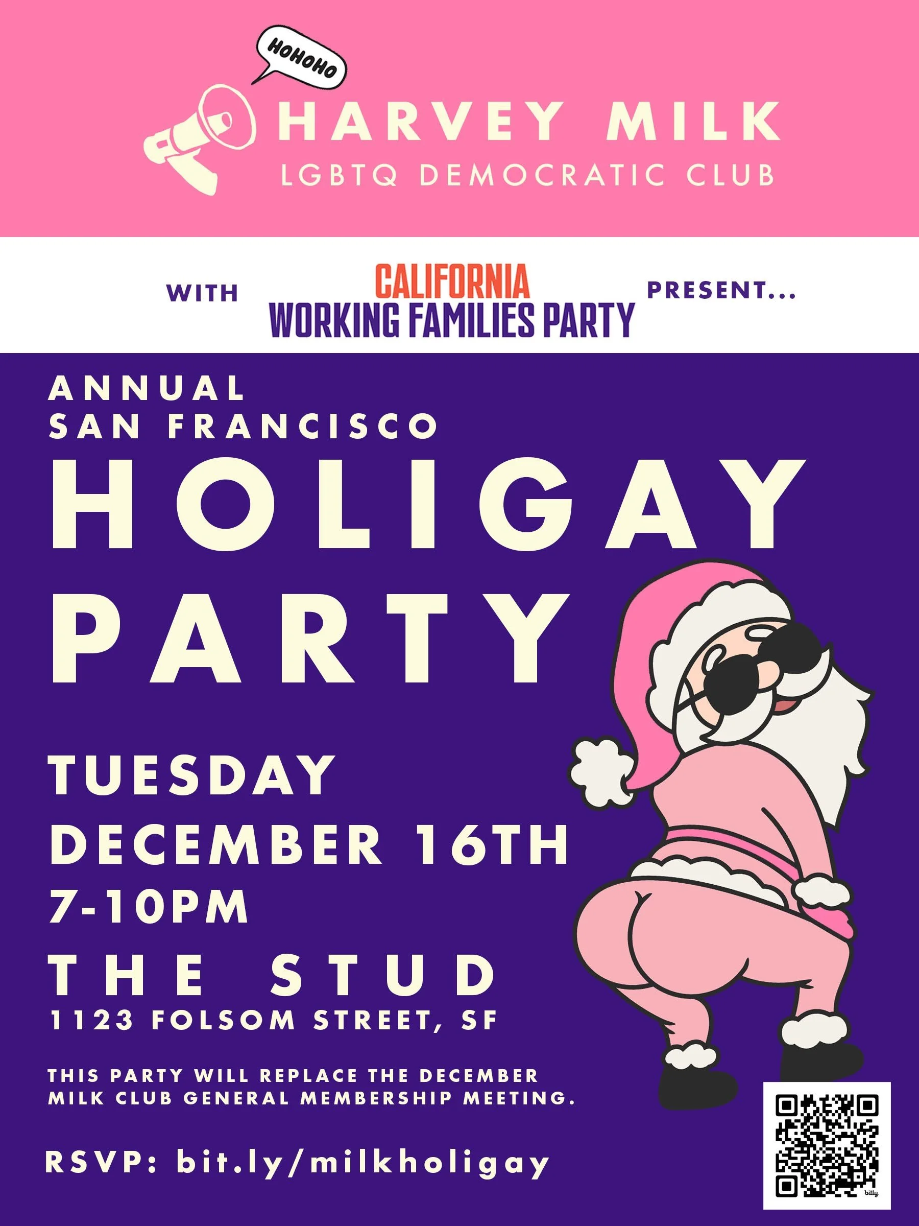 Join the Harvey Milk LGBTQ Democratic Club, our partners at California Working Families Party, and others for our annual San Francisco HoliGay Party! All are welcome. Come dressed for the season! Vote for the naughtiest supervisor. Enjoy entertainment, drinks, and food with your community.
