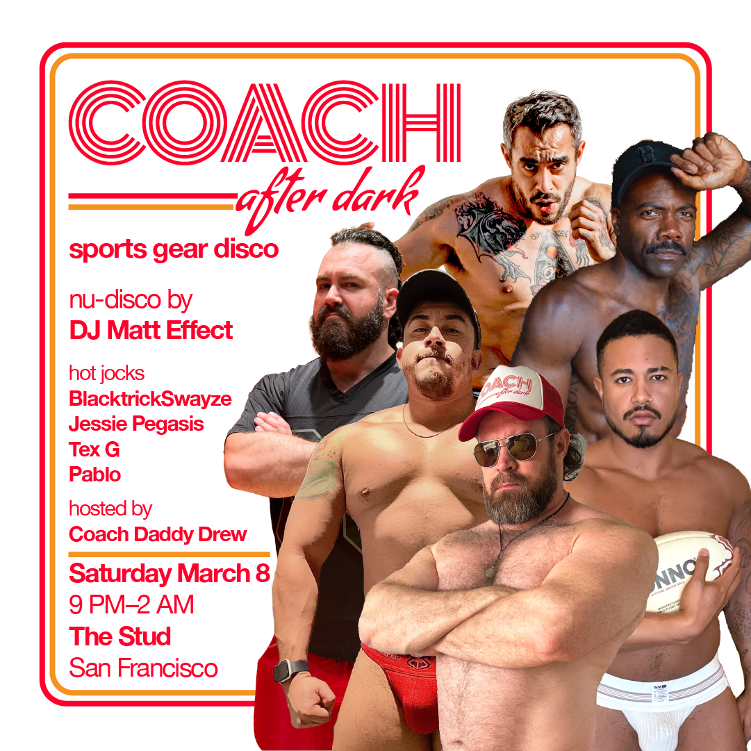 This Saturday the legendary sports gear disco returns to SF! DJ Matt Effect (LA) will be spinning an electrifying nu-disco set while our team of hot jock go-gos dazzle with athletic gyrations and “good sportsmanship.” Come get down with the team Saturday March 8, 9PM-2AM at The Stud. Singlets, jocks, and sports gear aren’t required but are VERY desired. Clothing check is available! Tickets here!
