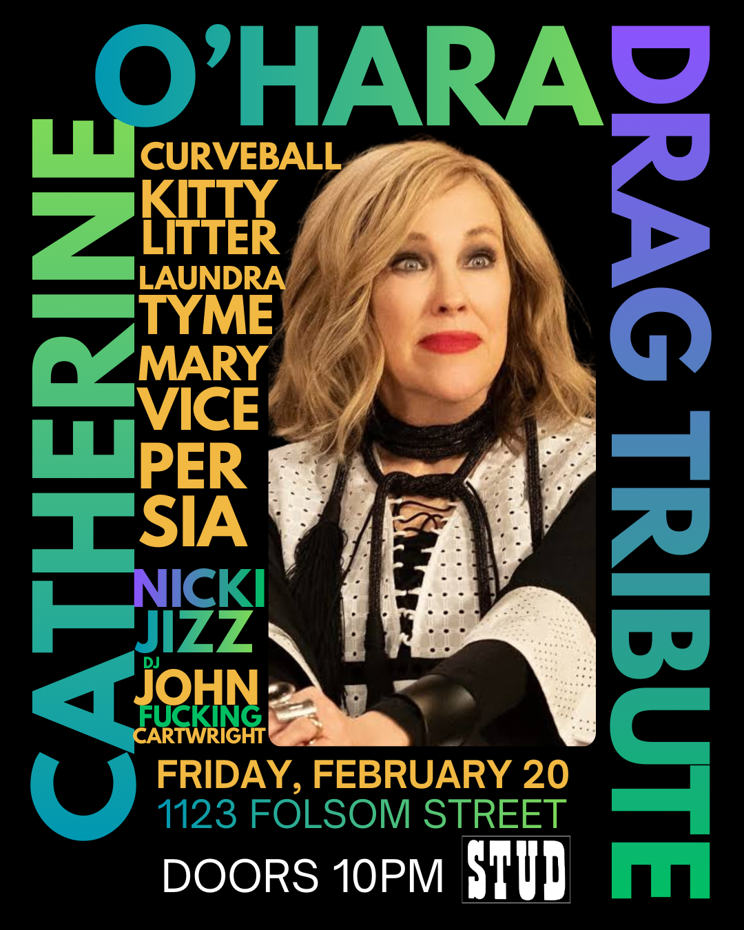 The Stud Presents: A Night celebrating comic queen, Catherine O’Hara. Come dance, have some drinks, shed a laugh and a tear, and most importantly, enjoy a drag show send-up with some of San Francisco’s favorite gals. Featuring: Curveball (our emcee) Kitty Litter Laundra Thyme Mary Vice (Pillows!) Per Sia (San Francisco's Drag Laureate) Nicki Jizz (Reparations) with dancing before /till close with John Fucking Cartwright.